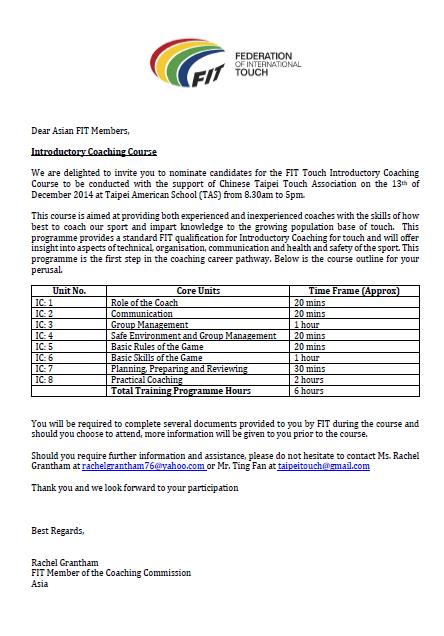 在國際觸球聯合會 (FIT),臺北美國學校 (TAS) 和 臺灣觸球協會 (CTTA) 的努力協作之下,我們非常榮幸的宣佈,有史以來在臺灣第1次舉辦的FIT初級教練講習課程將會由主辦單位臺灣觸球協會在臺北市舉行。